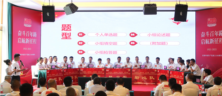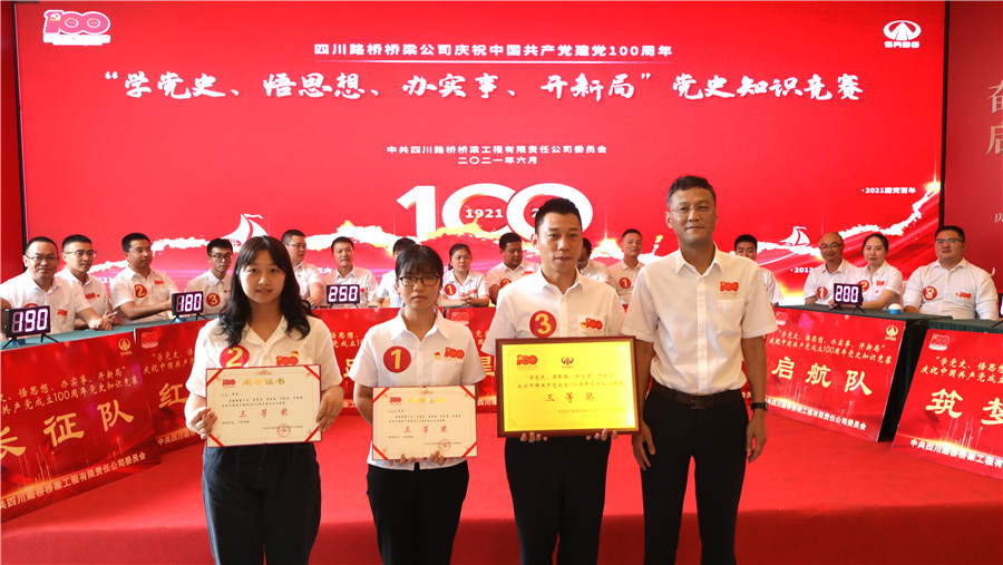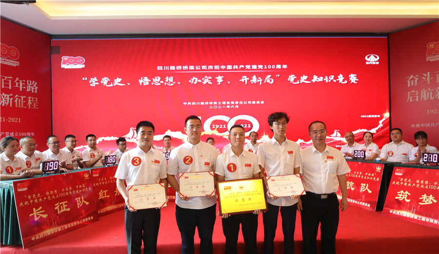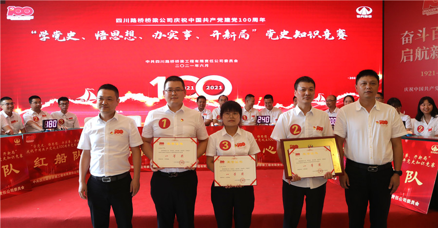 讓黨史學(xué)習(xí)“火”起來, 營造“比學(xué)趕超”良好氛圍。本次知識競賽已籌備一月有余,經(jīng)過六月初7000余人名職工和產(chǎn)業(yè)工人自發(fā)參與網(wǎng)絡(luò)初賽答題,到6月17日42家單位395名黨員、預(yù)備黨員及積極分子共同參與線上集中復(fù)賽答題,公司高質(zhì)量高標(biāo)準(zhǔn)把關(guān),甄選出22名黨建精英進(jìn)入總決賽,此次競賽涵蓋了中國共產(chǎn)黨建黨百年來的革命史、新中國史、改革開放史、社會主義發(fā)展史等選題內(nèi)容,共設(shè)五個(gè)環(huán)節(jié),分為個(gè)人必答題、小組必答題、搶答題、風(fēng)險(xiǎn)題、附加題。隨著比賽向前推進(jìn),現(xiàn)場競賽“火藥味”逐漸濃烈,臺上選手自信滿滿胸有成竹,臺下觀眾津津有味全程互動,長征隊(duì)、紅船隊(duì)、天路隊(duì)、星火隊(duì)、初心隊(duì)、啟航隊(duì)、筑夢隊(duì)七個(gè)隊(duì)伍你追我趕,還有“幸運(yùn)22”號實(shí)力加持、推波助瀾,將活動氛圍推向高潮。經(jīng)過激烈角逐,天路隊(duì)、初心隊(duì)和“幸運(yùn)22”、筑夢隊(duì)分別榮獲黨史知識競賽決賽的第一名、第二名、第三名,公司領(lǐng)導(dǎo)親自為獲獎隊(duì)伍頒發(fā)獎牌和榮譽(yù)證書,和所有參賽選手合影留念。“在黨史競賽決賽開始前,我還是花了大量時(shí)間做準(zhǔn)備, 如查看背誦‘學(xué)習(xí)強(qiáng)國’學(xué)習(xí)平臺、黨史學(xué)習(xí)教育官網(wǎng)號上的黨史知識、黨史事件,讓自己對一些模糊的知識變得更加清晰。而在比賽現(xiàn)場,通過問答的方式,像是一種‘溫故知新’,讓黨史學(xué)習(xí)效率得到提高,更像是一種“隔空對話”,重走了一次紅色歲月”,參賽選手如是說。本次知識競賽結(jié)合公司工作實(shí)際,將川橋“發(fā)家史”融入到黨史學(xué)習(xí)教育中,以賽促學(xué)、以學(xué)促行,堅(jiān)定了信仰之“基、補(bǔ)強(qiáng)了精神之鈣。
