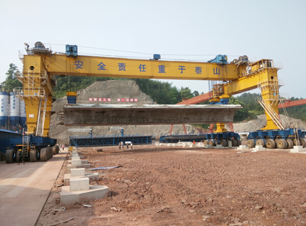 900T輪式提梁機是吊運箱梁的主要起重設備,自重550噸,額定運載能力900噸,凈跨寬度38米,起吊高度12.5米,主要用于24米至32米箱梁的脫模移梁施工。該提梁機的主體結(jié)構(gòu)由行走系統(tǒng)、起升系統(tǒng)、動力系統(tǒng)、液壓系統(tǒng)、電控系統(tǒng)、制動系統(tǒng)、操作系統(tǒng)等主要結(jié)構(gòu)組成。其外部主體結(jié)構(gòu)還包括端主梁與橫梁,主梁另有單主梁與雙梁形式;4條支腿、64個車輪。該機主結(jié)構(gòu)為門架結(jié)構(gòu),采用“人”字型支腿,可進行大幅度起升、高度調(diào)整和90°轉(zhuǎn)向跨區(qū)作業(yè),結(jié)構(gòu)先進、合理,操作可靠、安全,作業(yè)靈活。