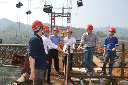 蔡樂軍董事長在磨刀溪特大橋鋼管拱合龍段與項(xiàng)目技術(shù)人員進(jìn)行交流