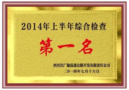 7月17日,四川巴廣渝高速公路開(kāi)發(fā)有限責(zé)任公司在廣安召開(kāi)2014年第二季度暨半年綜合大檢查總結(jié)會(huì),在會(huì)上巴南廣高速公路TJ1合同段第九分部同時(shí)摘得第二季度和半年綜合大檢查雙項(xiàng)第一名貴冠,這是繼去年榮獲業(yè)主半年綜合評(píng)比第三名之后,為公司在巴南廣高速公路建設(shè)中贏取的又一重要殊榮。
