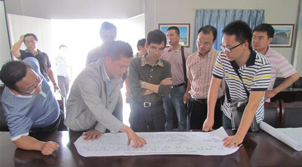 謝副市長(zhǎng)(前中)聽(tīng)取在四川路橋成貴鐵路項(xiàng)目經(jīng)理部黨工委書(shū)記夏勇(前左二)匯報(bào)我部征拆推進(jìn)情況。