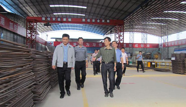 謝副市長(zhǎng)(前右一)在四川路橋成貴鐵路項(xiàng)目經(jīng)理部黨支部書(shū)記夏勇(前左一)陪同下參觀一分部標(biāo)準(zhǔn)化鋼筋加工場(chǎng)。