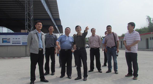 謝副市長(zhǎng)(前中)在四川路橋成貴鐵路項(xiàng)目經(jīng)理部黨支部書(shū)記夏勇(前左一)陪同下參觀一分部標(biāo)準(zhǔn)化拌和站。