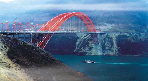 重慶巫山長江大橋全長612.2米,主跨460米,中承式鋼管砼拱橋,主跨居同期同類橋梁世界第一,創(chuàng)下組合跨徑、每節(jié)段纜索吊裝重量、吊塔距離、拱圈管道直徑和吊裝高度5項世界第一,名列“世界百座名橋”,2005年1月建成通車。