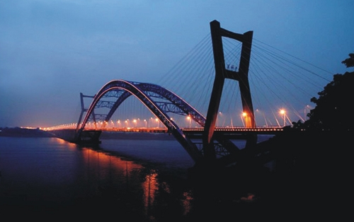 湖南湘潭蓮城大橋 主跨400米,雙飛燕斜拉鋼管砼拱橋,2007年7月建成通車,世界首座斜拉鋼管拱橋。單側(cè)吊裝節(jié)段27段,單節(jié)段最大吊重120噸,公司承擔(dān)主拱吊裝工程。
