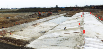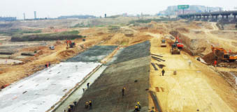 工程包括省道S105線綿竹段石亭江一號橋、石亭江廣洛大橋、富新綿遠(yuǎn)河大橋三座基礎(chǔ)防護工程。由于歷年來采砂嚴(yán)重,造成河床遠(yuǎn)低于原設(shè)計標(biāo)高,為恢復(fù)橋下沉積物,保證橋梁樁基安全使用。設(shè)計采用在橋下游100米左右處修建砼復(fù)式斷面攔河防沖壩,以淤積橋下沉積物,保證橋梁樁基的埋置深度,從而保證橋梁安全使用。三座橋工程量共計土石方工程量約300000立方米,C30鋼筋砼壩體及護岸砼澆筑約50000立方米,帶肋鋼筋約1500噸。